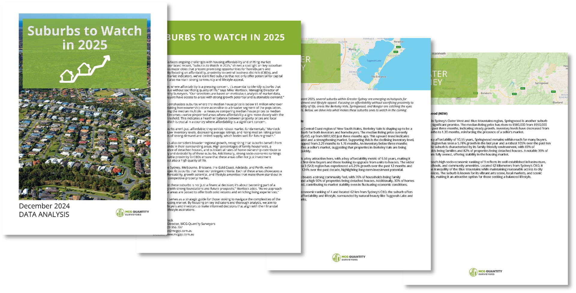 “In a market where affordability is a pressing concern, it’s essential to identify suburbs that provide value without sacrificing quality of life,” says Mike Mortlock, Managing Director of MCG Quantity Surveyors. “Our selections are based on meticulous analysis of market data, ensuring buyers have access to areas with strong growth potential and sustainable demand.”